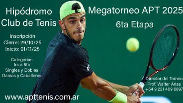 Se encuentra abierta la inscripción para la 6ta Etapa de Megatorneo APT 2025 que se desarrollará en el Hipódromo Club de Tenis de la ciudad de La Plata.